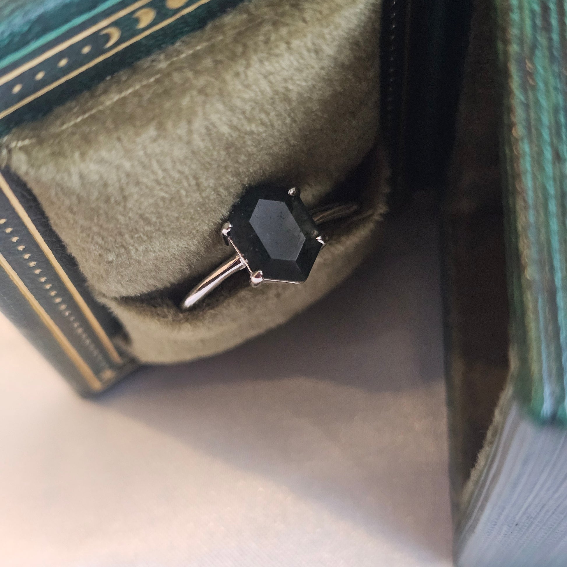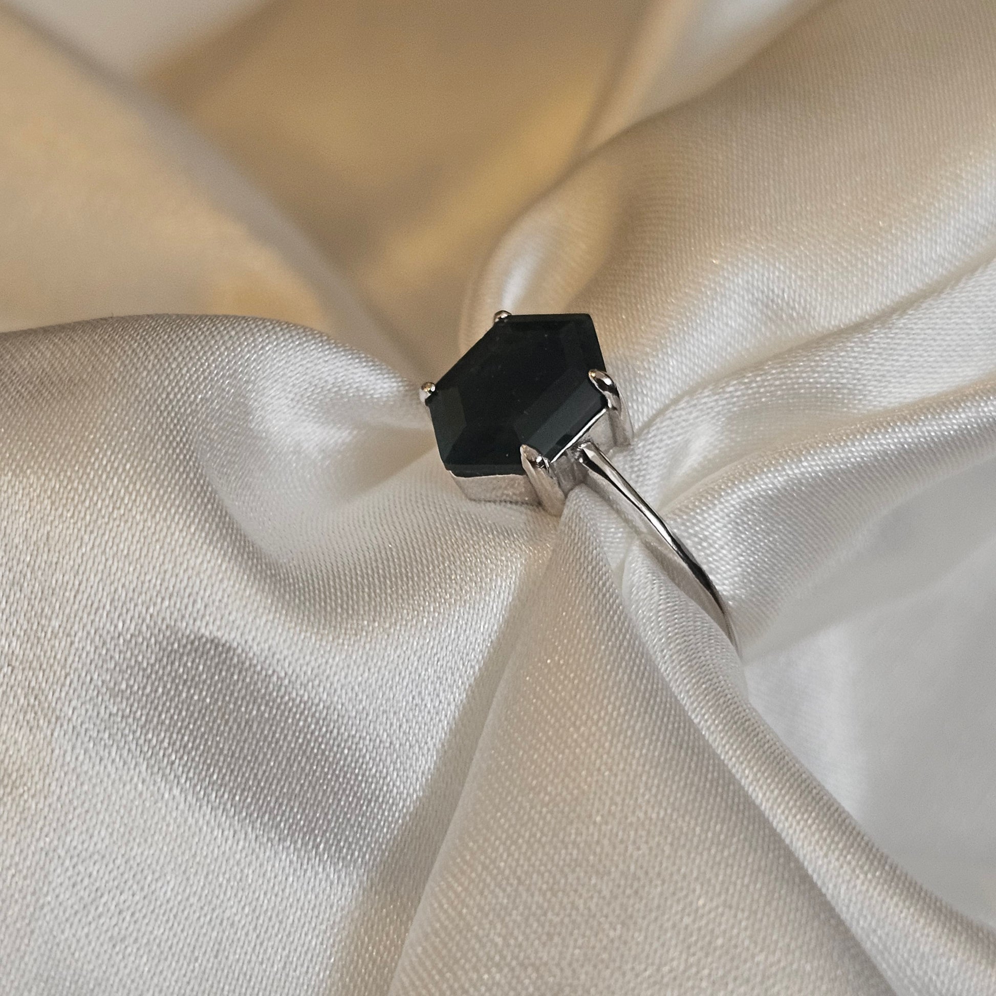 Discover the quiet beauty of nature in this hexagon-cut Moss Agate ring.