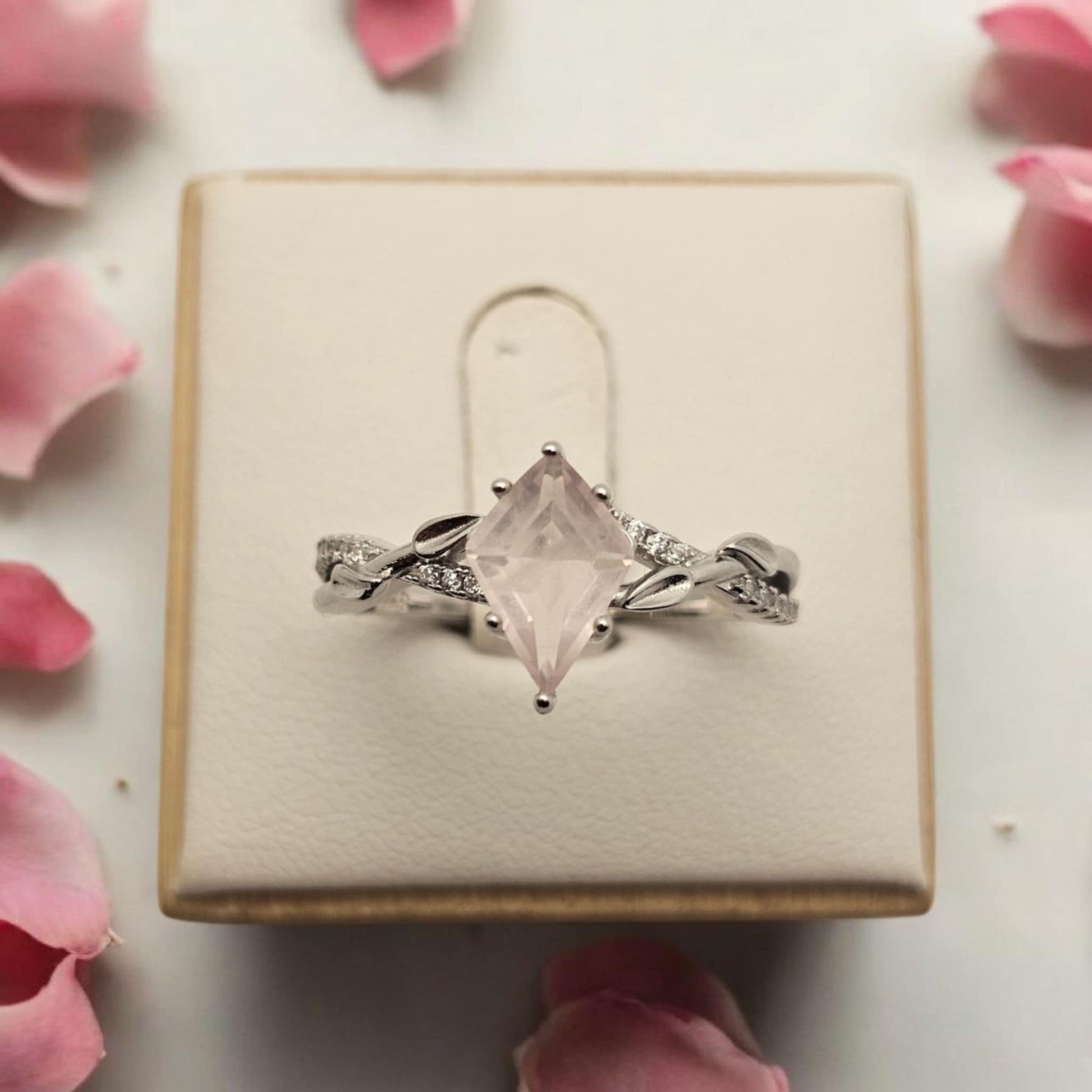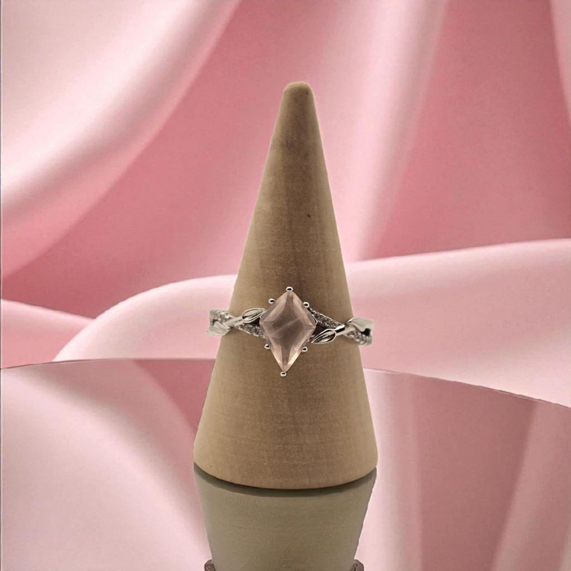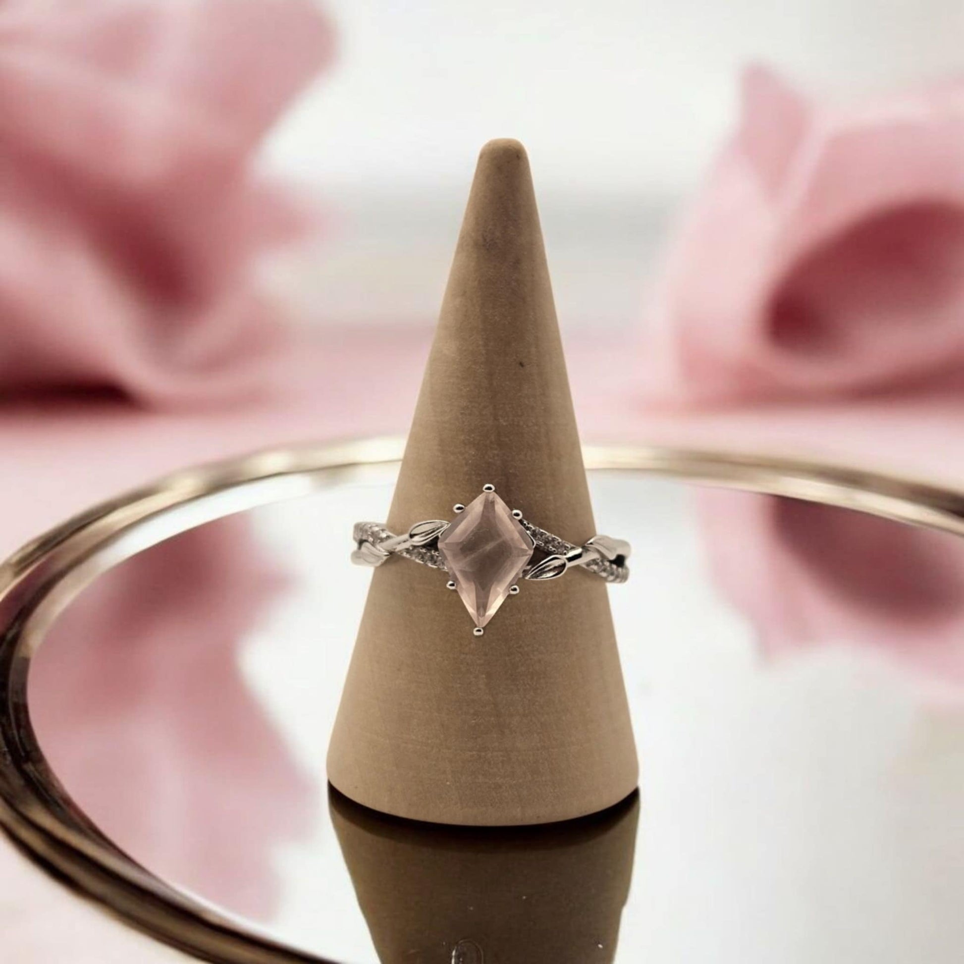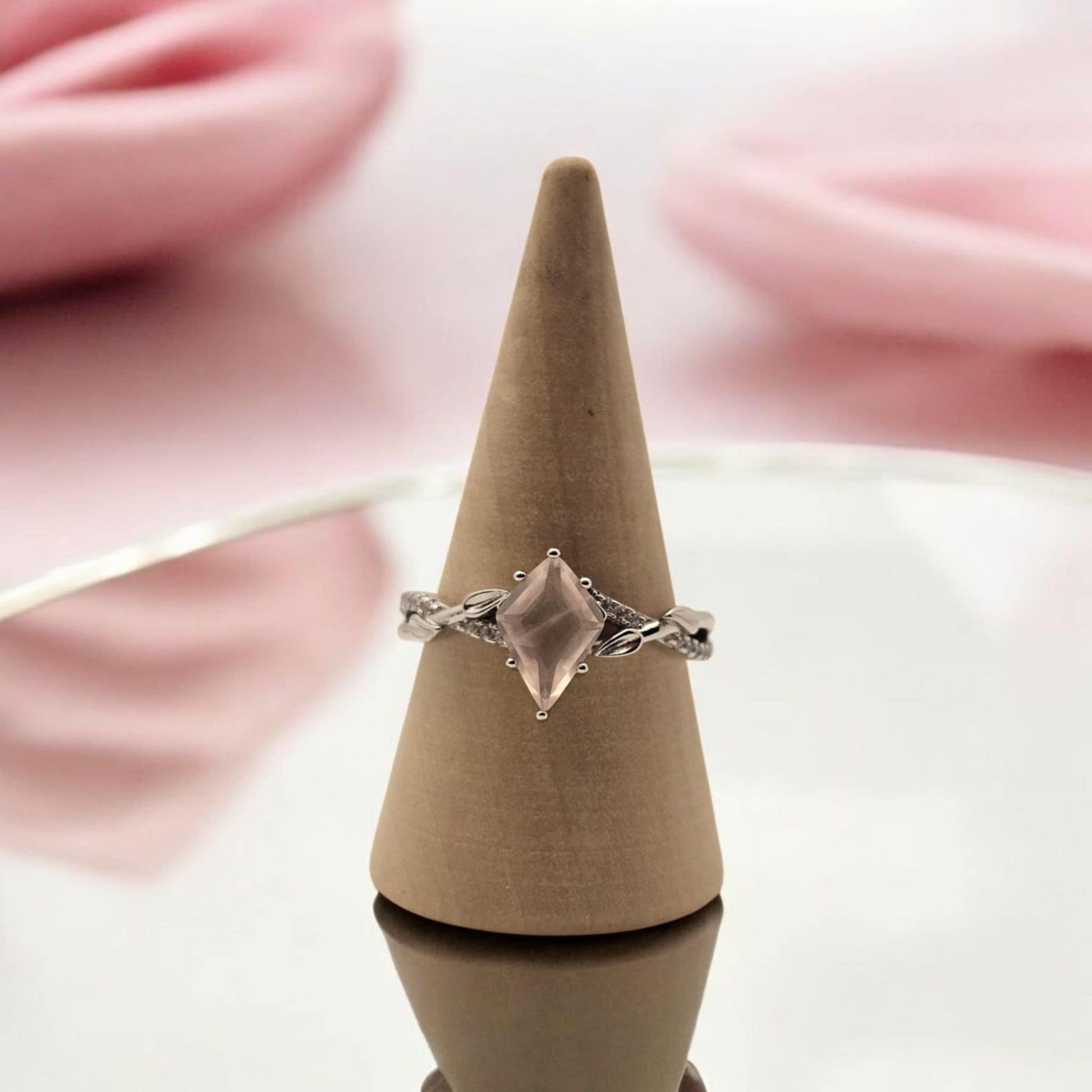 The Quartz Crown Ring features a distinctive kite-cut rose quartz, set on a twisted sterling silver band for a look that’s both romantic and modern. Crafted in 925 sterling silver with platinum plating, this design blends gemstone beauty with timeless craftsmanship.