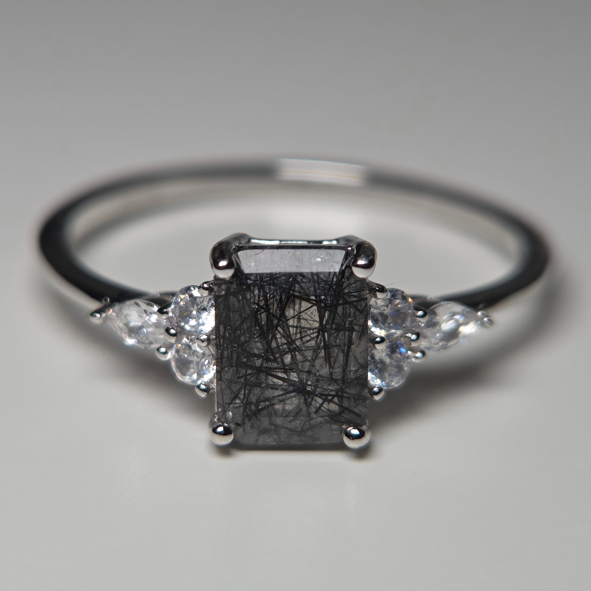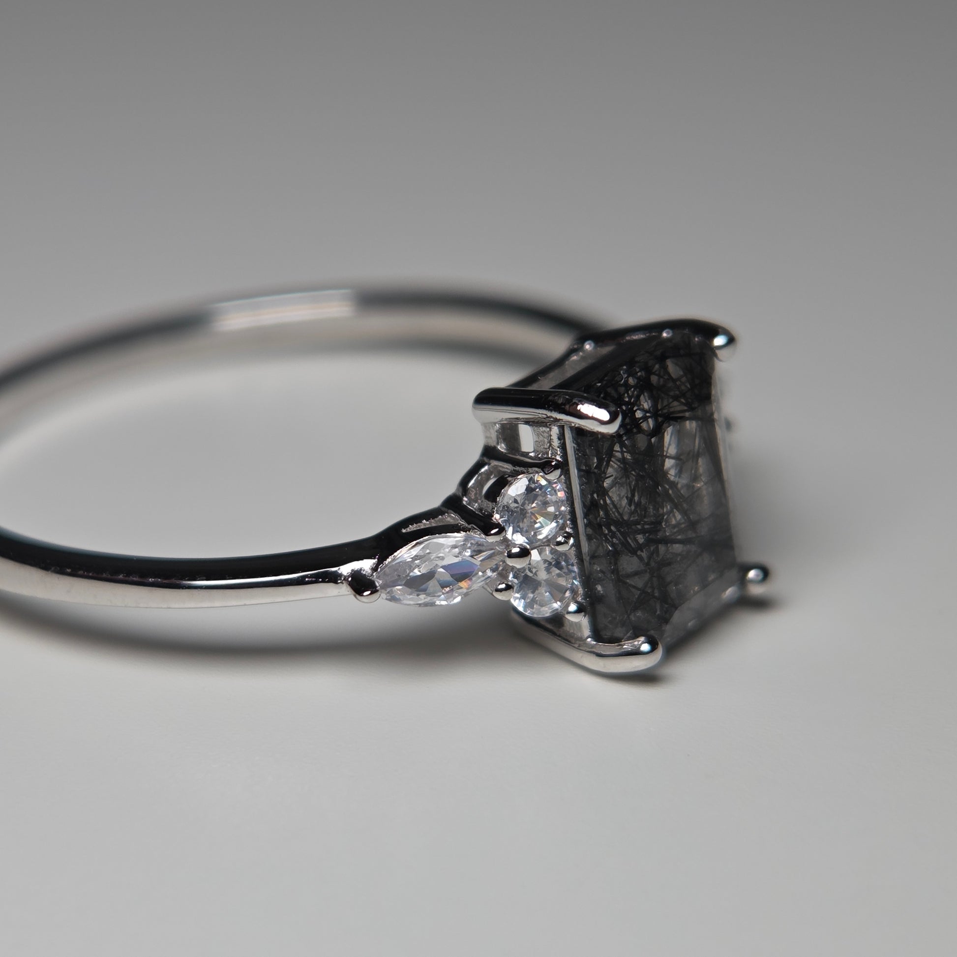 The Black Shard Ring features a natural emerald-cut rutilated quartz, clear in body and marked with fine black rutile inclusions formed naturally within the stone. These dark, shard-like lines give each ring its own distinctive pattern, meaning no two are ever the same.