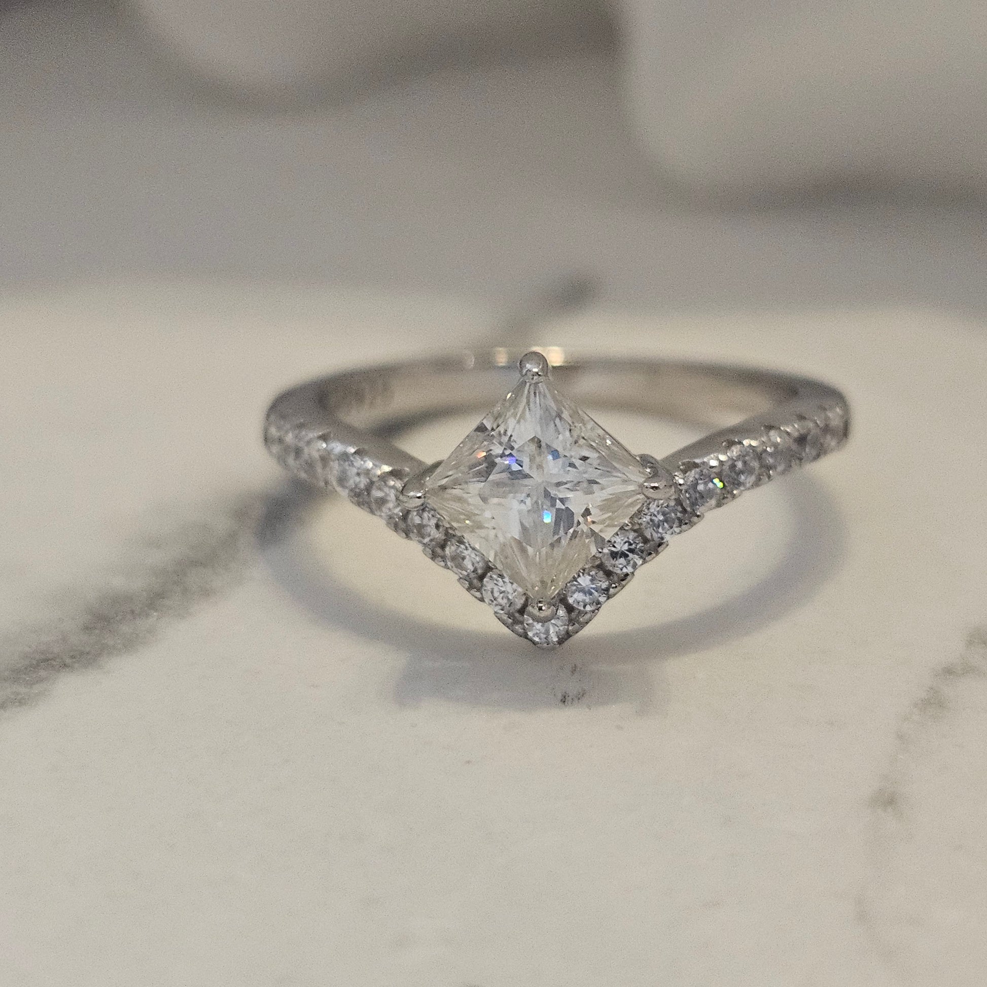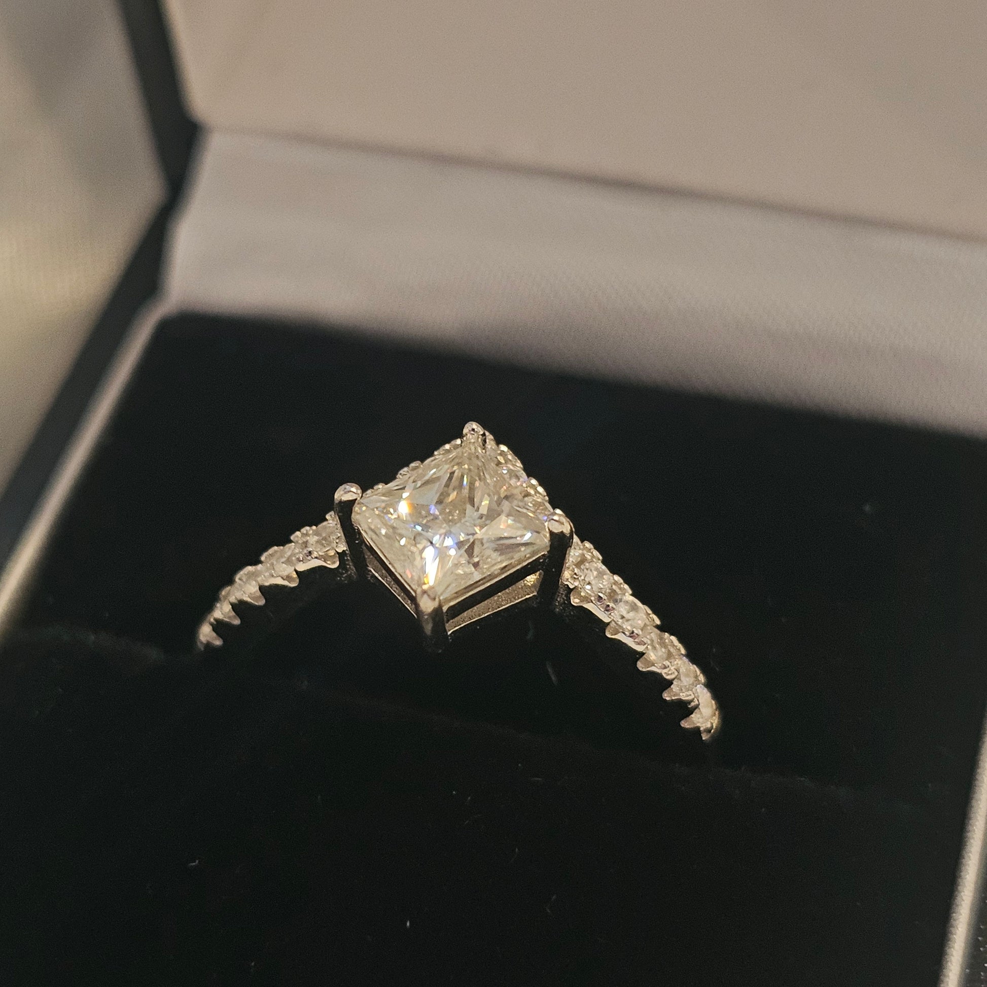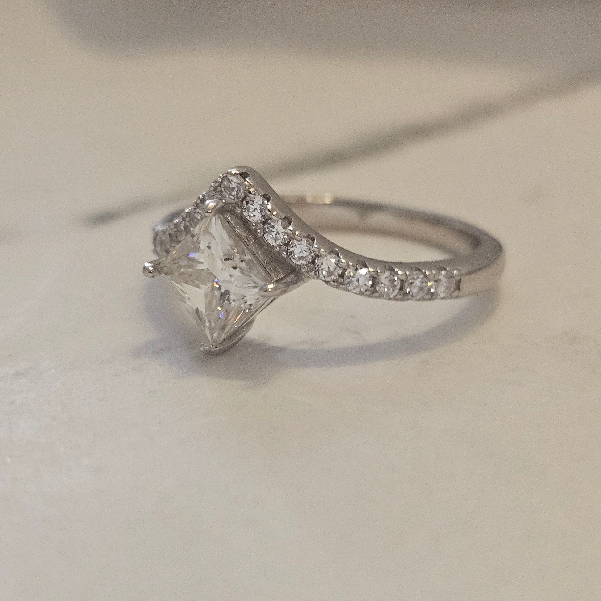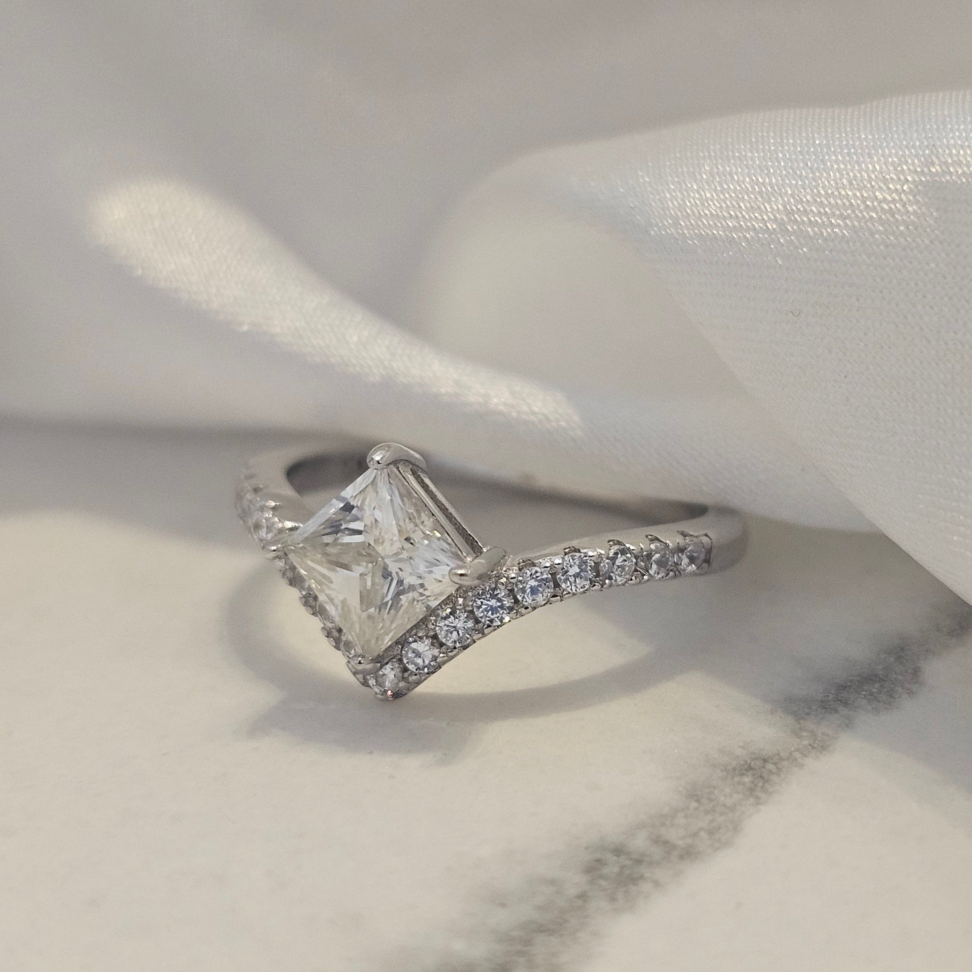 The Silver Cascade Ring is a statement of elegance and modern romance. Featuring a 1ct princess cut moissanite, this dazzling centre stone is framed by a flowing pavé band that shimmers with every movement. Crafted in sterling silver, the design creates the illusion of a sparkling cascade, making it both timeless and unique.